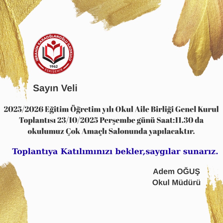 2025/2026 EĞİTİM ÖĞRETİM YILI OKUL AİLE BİRLİĞİ GENEL KURUL TOPLANTISI 23/10/2025 PERŞEMBE GÜNÜ SAAT : 11.30 DA YAPILACAKTIR. KIYMETLİ VELİLERİMİZİN TOPLANTIYA KATILIMINI BEKLER, SAYGILAR SUNARIZ.